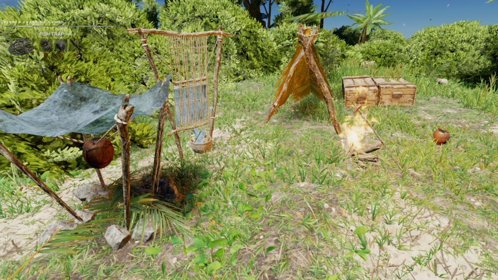 ココナッツ集め、火起こし、水の確保、シェルター構築、カニや魚等の食料確保…