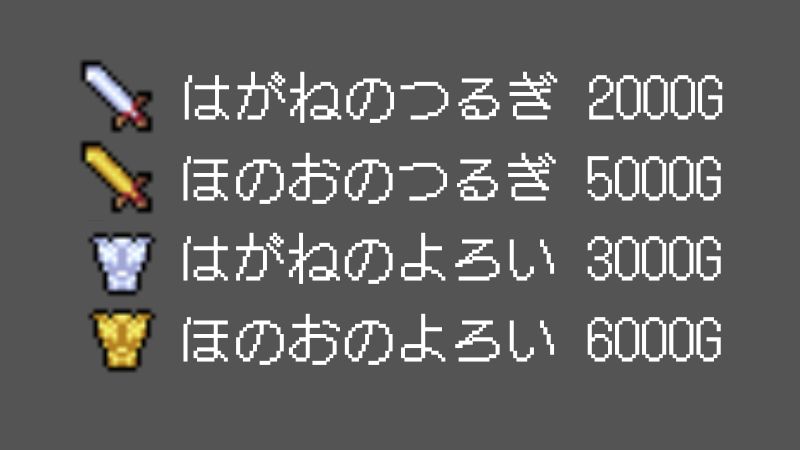 当時のRPGでは基本的に、先に進めば進むほど強い武器や防具が店に並びます。